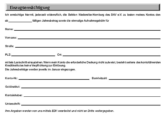 Bei Interesse bitten wir Sie, die Einzugsermächtigung auszudrucken und zusammen mit Ihrem Aufnahmeantrag an die Sektion Niederelbe-Hamburg einzusenden. |