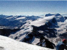 Ein Blick in die Nordwand, tief im Tal Sulden, einfach super. Am Gipfel sind neben uns einige Seilschaften. Wir haben ein riesiges Glück. Traumwetter, Traumbedingungen, Traumberg. Ein wunderschönes Ergebnis. Am Ende der Woche steht König Ortler auf dem Programm Wir sind auf der Payerhütte und haben einen urigen Hüttenabend. Wiederum haben wir das Glück eines ganz besonderen Ereignisses. Musiker aus Kastelruth spielen im letzten Tageslicht einige Melodien auf ihren Alphörnern. Eine wunderschöne Stimmung, die sicher allen im Gedächtnis bleibt. Früh am Morgen stehen wir vor der Hütte. Von Westen ziehen dunkle Gewitterwolken heran und am Horizont blitzt es. Über uns ist der Himmel klar. Wir gehen los und klettern durch die Felsen bis zum Gletscherübergang. Am Bärenloch vorbei zieht sich der Weg über bis 35o steilen Firn zum Gipfel. Wir haben wieder gute Bedingungen am Berg. |