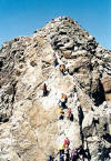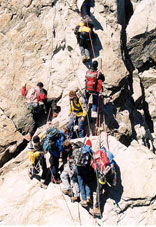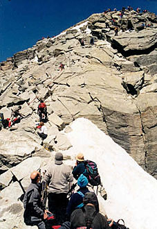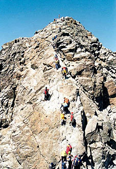 Nach Überschreitung des Kleinglockner öffnet sich der Blick auf den Großglockner und die berühmt-berüchtigte Glocknerscharte. Nun wird klar, warum von dieser Scharte so viel zu lesen ist. Vor uns herrscht das schiere Chaos. Etwa 50 Bergsteiger in mehreren Seilschaften im Auf- und Abstieg mühen sich, die Scharte zu queren, die zwar ausgesetzt, aber doch nicht so gefährlich schmal ist, wie ich es nach der Lektüre des AV-Führers annahm. Einige Seilschaften haben Fixseile gespannt, in die sich ihre Leute mit Karabiner einhängen. Seile sind ineinander verstrickt, schwache Kandidaten werden geschoben und gezogen, letzten Endes herrscht im Wesentlichen Stillstand. Eine Gruppe kehrt offensichtlich um, weil sie die Kletterei (II) nicht schafft. Gruppenführer rufen Anweisungen, die kaum umgesetzt werden können, denn mancher Bergsteiger scheint überfordert zu sein. |