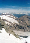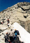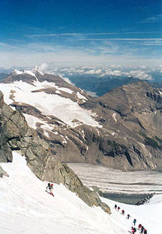 Am Fuß des Glocknerleitl (30 o ?) schnallen wir Steigeisen unter die Stiefel, binden uns ins Seil und steigen in mehreren Kehren die verschneite steile Gletscherflanke hinauf. So erreichen wir den Fels des Kleinglockner und können nun Steigeisen und Stöcke ablegen. |