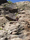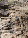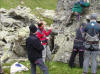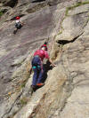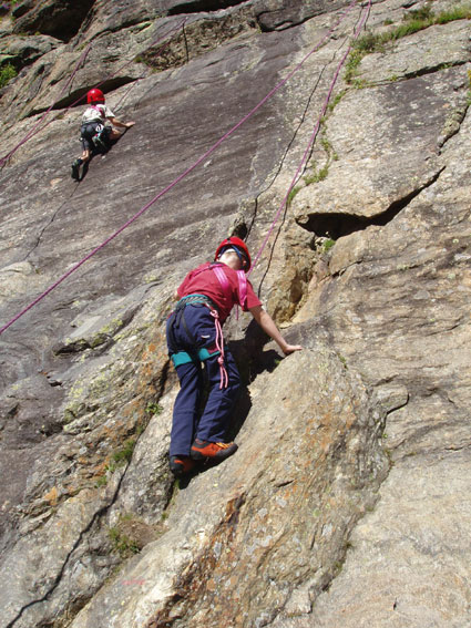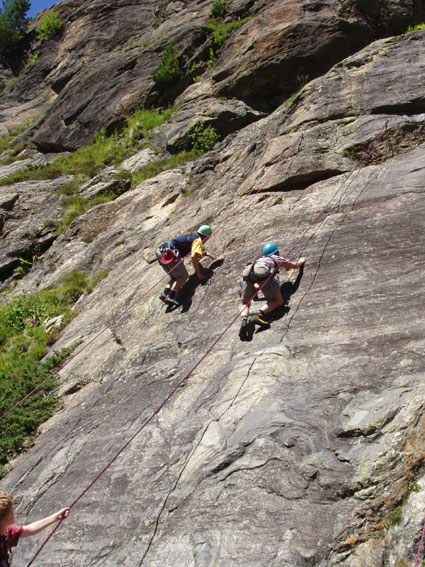 Für Dienstag, unser 2. Tag, stand „unser Matterhorn“ auf dem Programm, ein riesiger Block im Riffeltal. Zunächst einige Balancier- und leichte Kletterübungen und dann richtiges Klettern auf 4 Routen, natürlich top-rope-gesichert vom Kletterpartner. Das machte allen Spaß. Noch vor dem Abendessen wurden Steigeisen und Grödel für die morgige Gletschertour angepasst. | ||||
