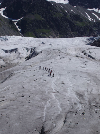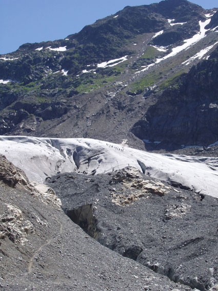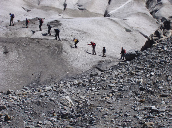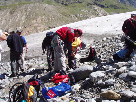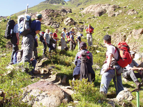 An vielen Rundbuckeln mit fantastischem Gletscherschliff und über reißende Gletscherbäche stiegen wir in 2 Seilschaften mit Steigeisen auf die Gletscherzunge des Gepatschgletschers. Es folgten Übungen zur Bewegungstechnik und einige hübsche Spielchen mit Pickel und Eisschrauben. Und wieder herrschte Superwetter mit angenehmer Temperatur und strahlend blauem Himmel. Auf dem Rückweg zur Hütte folgte dann ein absolutes highlight, der „Flying Fox“, eine rasante Fahrt am schrägen Seil vom einen auf das andere Bachufer. | ||||