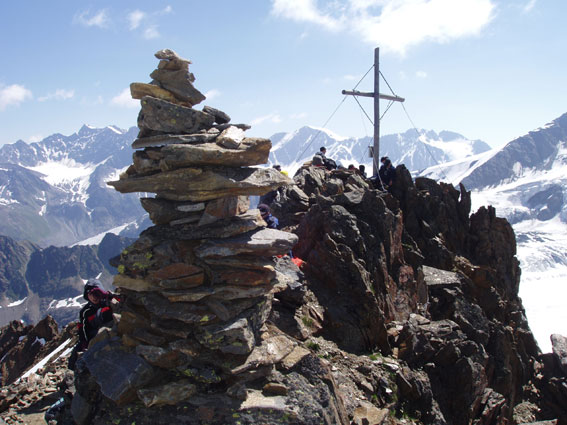 Unser letzter Tag führte uns von der Bergstation Weisssee (ca. 2700 m) auf den Wiesjackelkopf (3130 m), für viele der erste Dreitausender. Und wie das bei wiederum herrlichen Wetter so ist, bot sich uns ein schöner Rundblick. | ||||